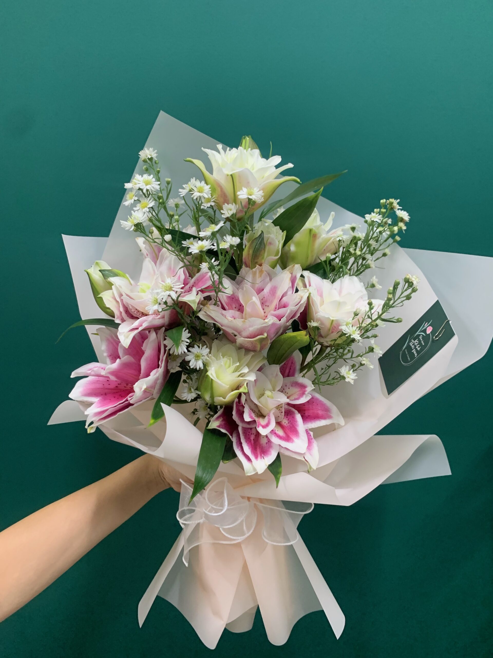 Một bó hoa ly rực rỡ nhưng không quá phô trương – hòa giữa hồng phấn và trắng ngà, điểm chút xanh mát. “Hương Ly” mang đến cảm giác thanh tao, nhẹ nhàng như nụ cười sớm mai.