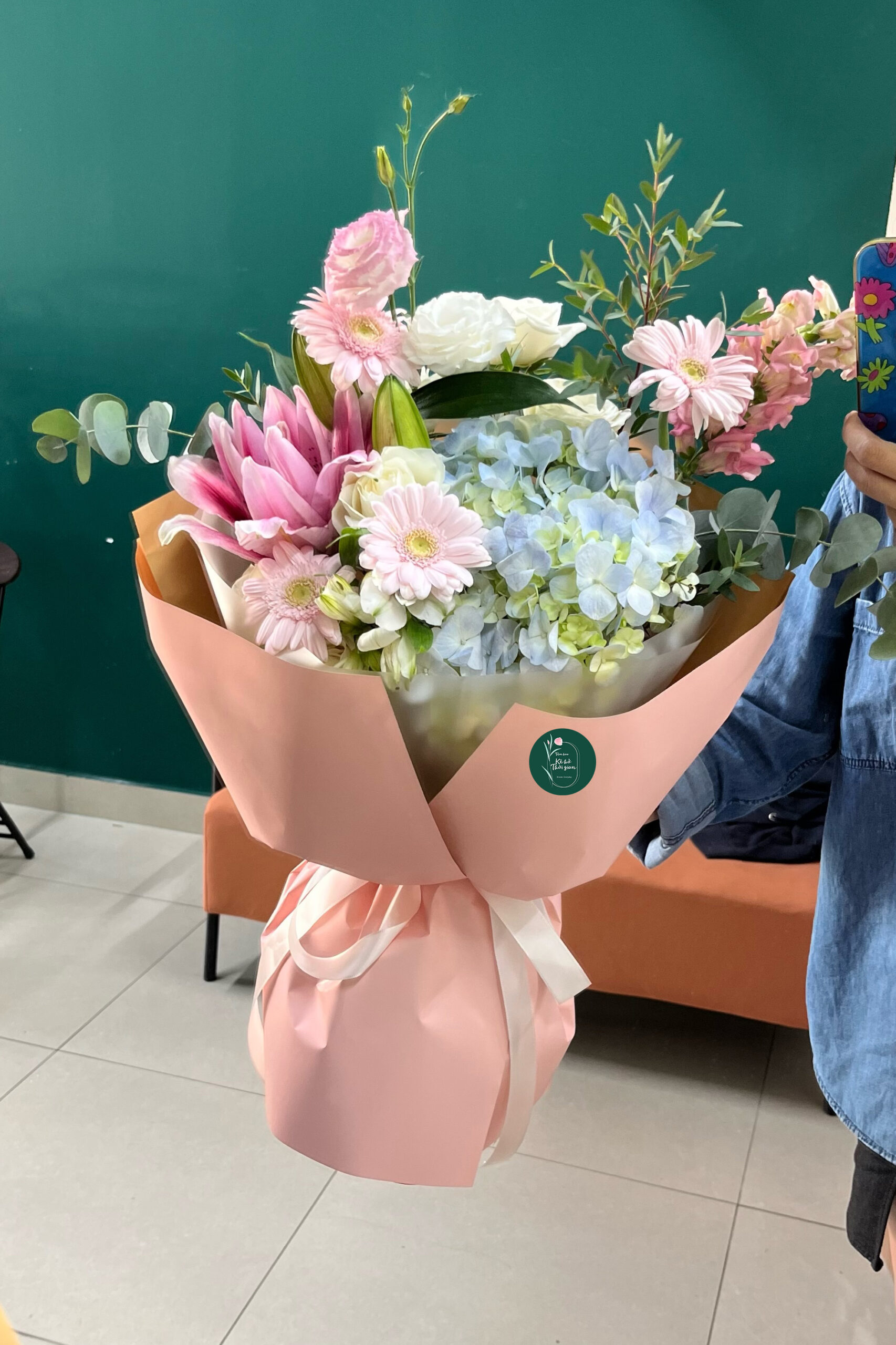 Sắc hồng dịu ngọt hòa cùng xanh pastel nhẹ nhàng, tạo nên một bó hoa như lời chúc êm ái gửi đến người bạn yêu thương.