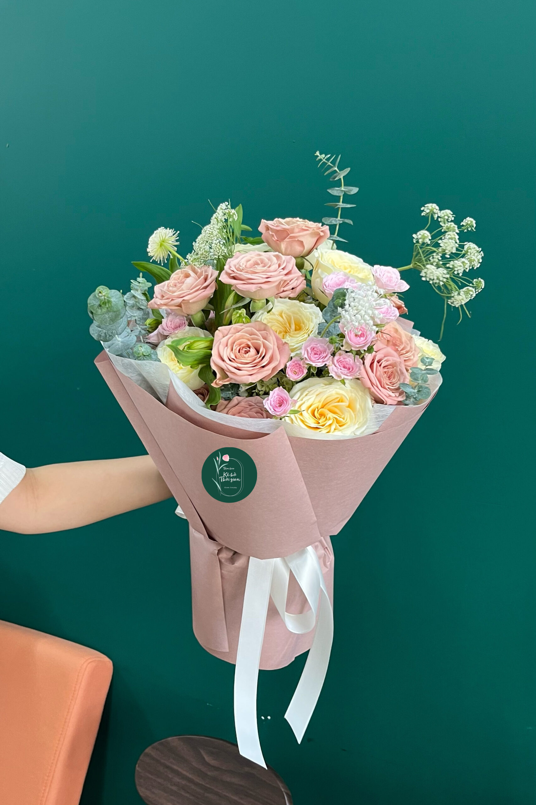 Như khoảnh khắc nắng cuối ngày khẽ rơi trên hiên nhà, Buổi Chiều Vàng mang theo hơi ấm dịu dàng của mùa thu. Những cánh hồng vàng rực rỡ hòa cùng hồng capuchino lạ lẫm, xen kẽ là những đóa hoa nhỏ nhẹ nhàng điểm xuyết, tạo nên bản giao hưởng của ánh sáng và sắc hương. Mỗi bó hoa là một buổi chiều lưu giữ trong tay – ấm áp, thanh bình và đủ để khiến trái tim chậm lại đôi chút, như đang đứng trong khe hở của thời gian.