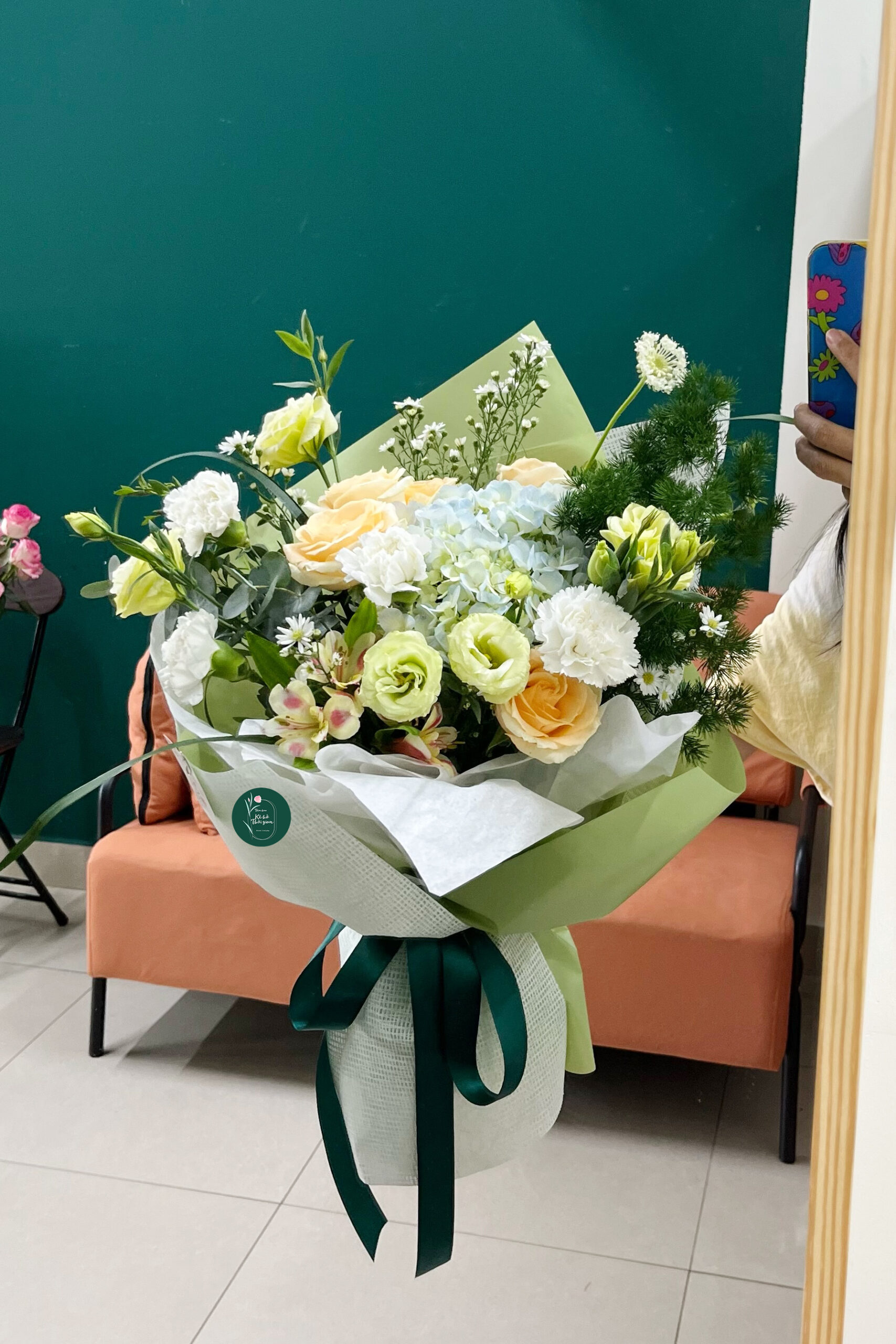 Bó hoa được thiết kế với tone màu xanh lá chủ đạo, tượng trưng cho sự tươi mới, sức sống và may mắn – màu sắc hợp với người mệnh Mộc.