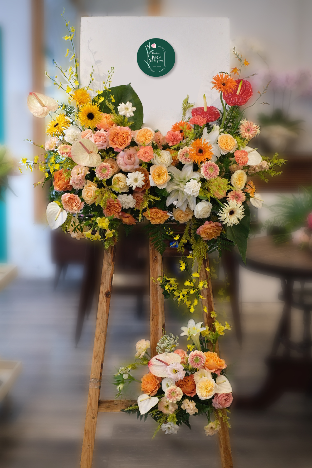 Thiết kế được phối khéo léo từ các loại hoa hồng, hướng dương, hoa ly, vũ nữ, đồng tiền, hồng môn… tạo cảm giác sang trọng nhưng vẫn gần gũi, tươi trẻ.