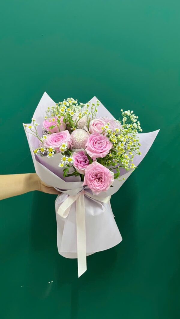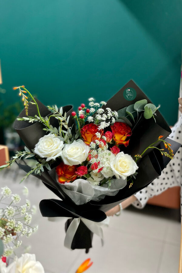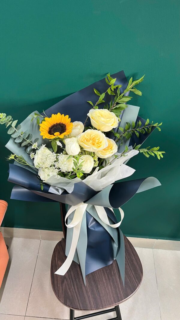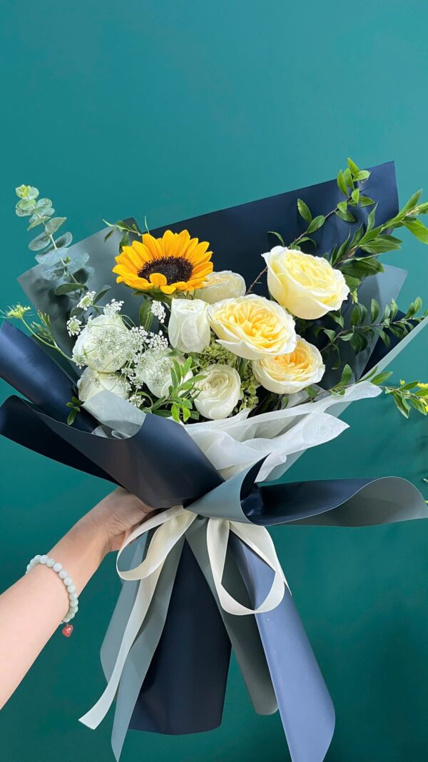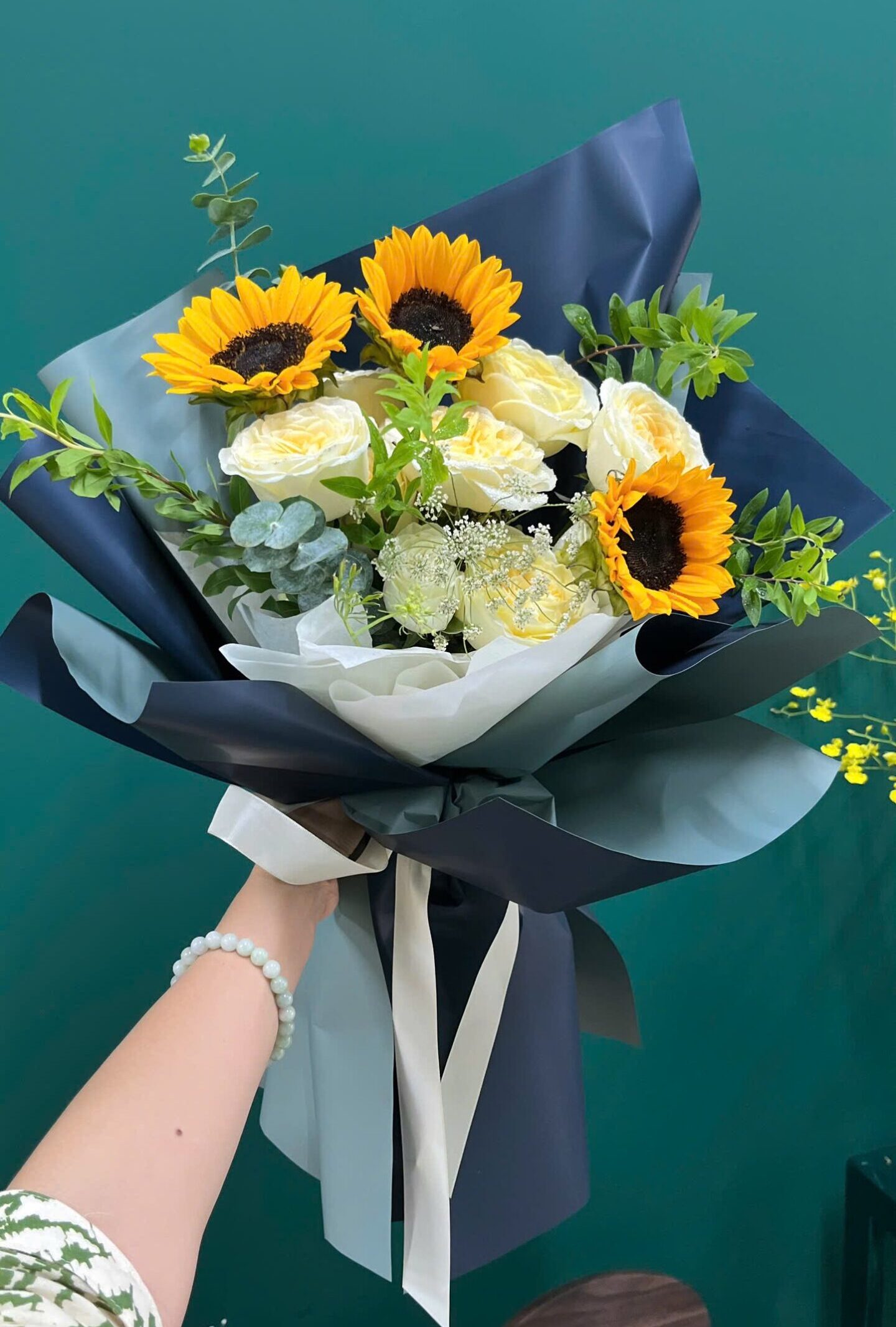 • Hướng dương hướng về mặt trời như chính bạn vươn tới ước mơ, trong khi hồng victor tượng trưng cho sự quyết đoán và niềm đam mê rực cháy. Điểm xuyết những loài hoa phụ tinh tế, bó hoa mang đến năng lượng tích cực, truyền cảm hứng để bắt đầu một hành trình mới với trọn vẹn niềm tin.
