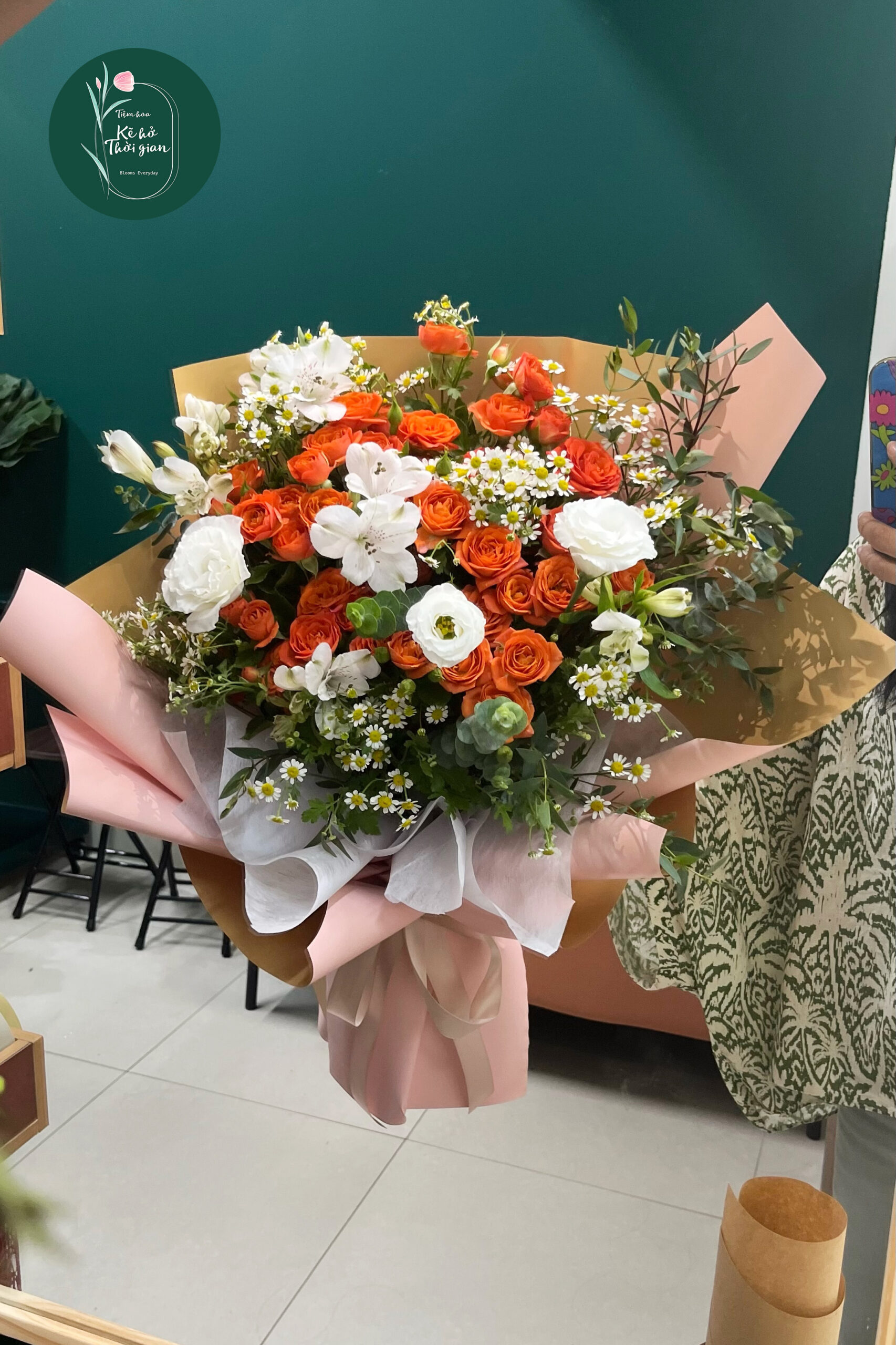 Sự kết hợp hài hòa giữa hồng chùm cam rực rỡ, cát tường trắng tinh khôi và những cánh cúc tana nhỏ xinh tạo nên một tổng thể tươi sáng, duyên dáng và đầy sức sống. Bó hoa không chỉ mang vẻ đẹp ngọt ngào mà còn là lời chúc trọn vẹn, chan chứa yêu thương gửi đến những người thân thương nhất của bạn.