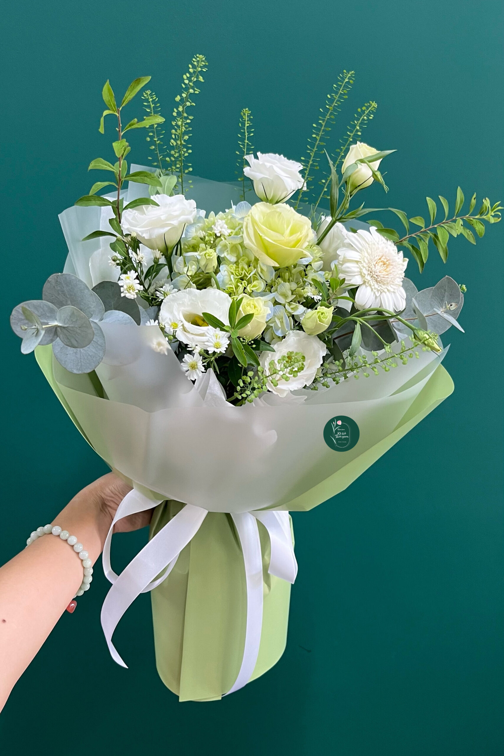 “Làn Gió Nhẹ” là bó hoa mang sắc trắng – xanh dịu nhẹ, trong trẻo như một buổi sáng tinh khôi. Không cầu kỳ, không phô trương – chỉ là cảm giác bình yên và dịu dàng mà ai trong chúng ta đôi khi đều cần được nhận.