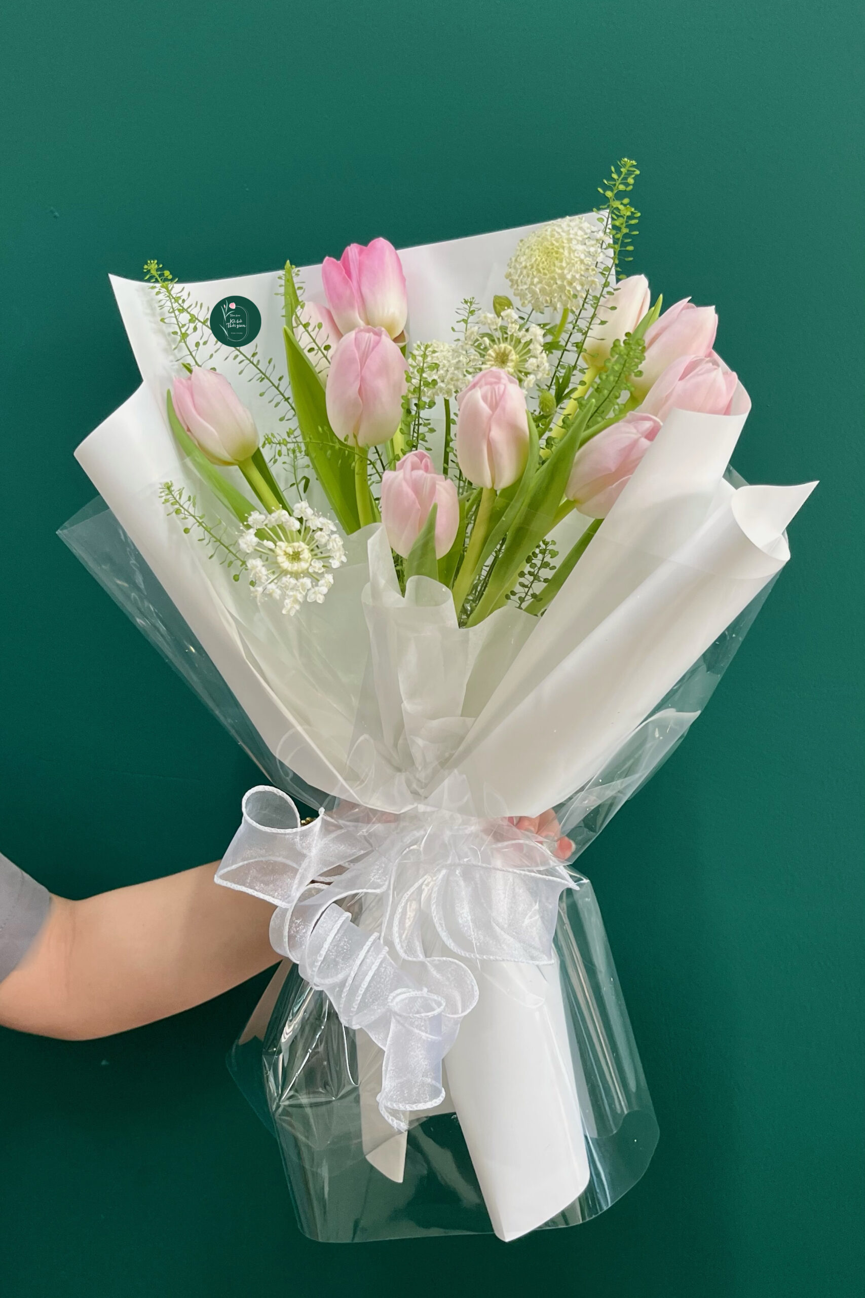 Bó hoa tulip hồng pastel với thiết kế tinh tế, sang trọng, phù hợp cho mọi dịp: tặng sinh nhật, kỷ niệm, tỏ tình, hoặc đơn giản chỉ là gửi một lời yêu thương.