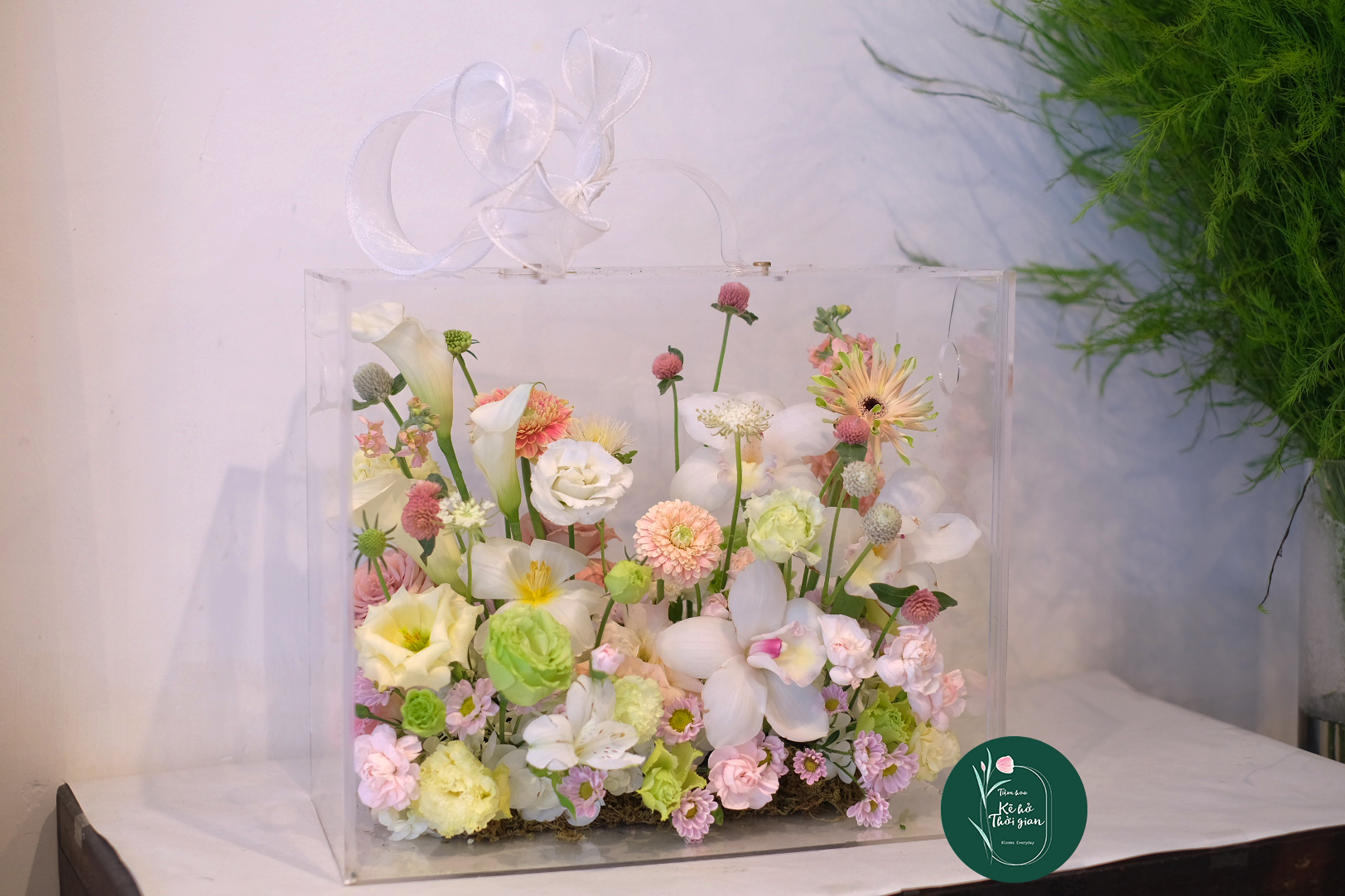 - Bình hoa mica trong suốt làm tôn lên vẻ đẹp tự nhiên của từng cánh hoa, tựa như ánh sáng lấp lánh khi sớm mai chạm vào giọt sương:
