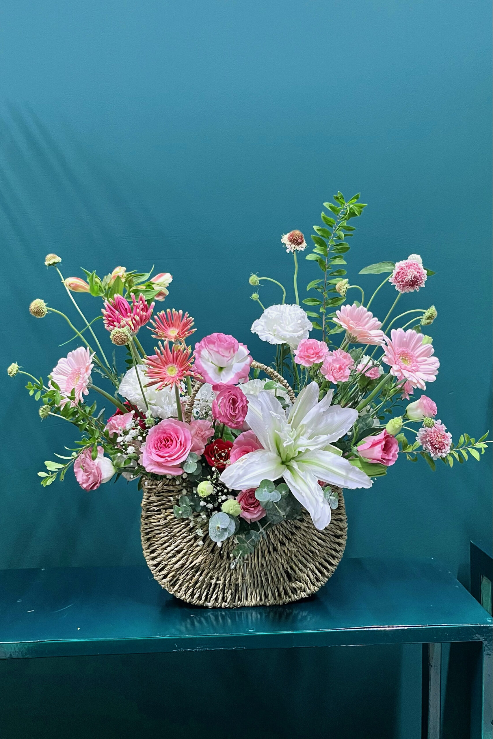 - Sự kết hợp hài hoà giữa hoa hồng hồng phấn, đồng tiền hồng ngọt ngào, cùng các loài hoa và lá phụ tông hồng nhẹ nhàng, gợi lên cảm giác trong trẻo, dịu dàng và tươi sáng – như ánh nắng ban mai vừa kịp ghé ngang khung cửa sổ.