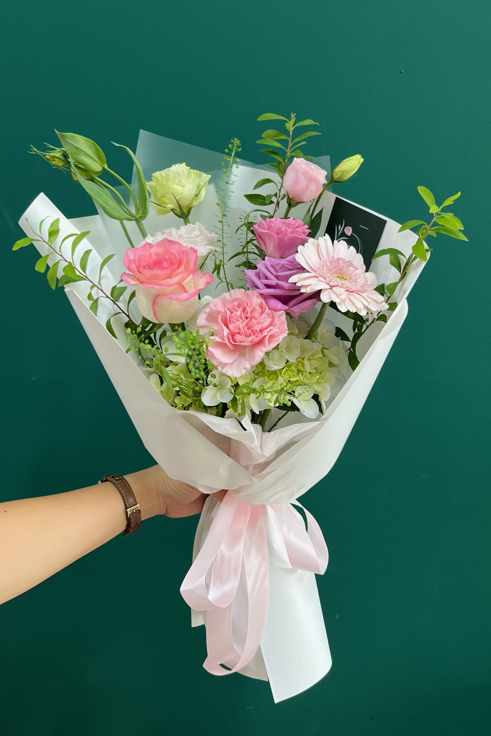 Nhỏ nhắn, tinh tế, nhưng tràn đầy yêu thương – bó hoa xinh xắn tone hồng pastel dịu nhẹ này sẽ khiến tim bạn “tan chảy” ngay từ ánh nhìn đầu tiên.
