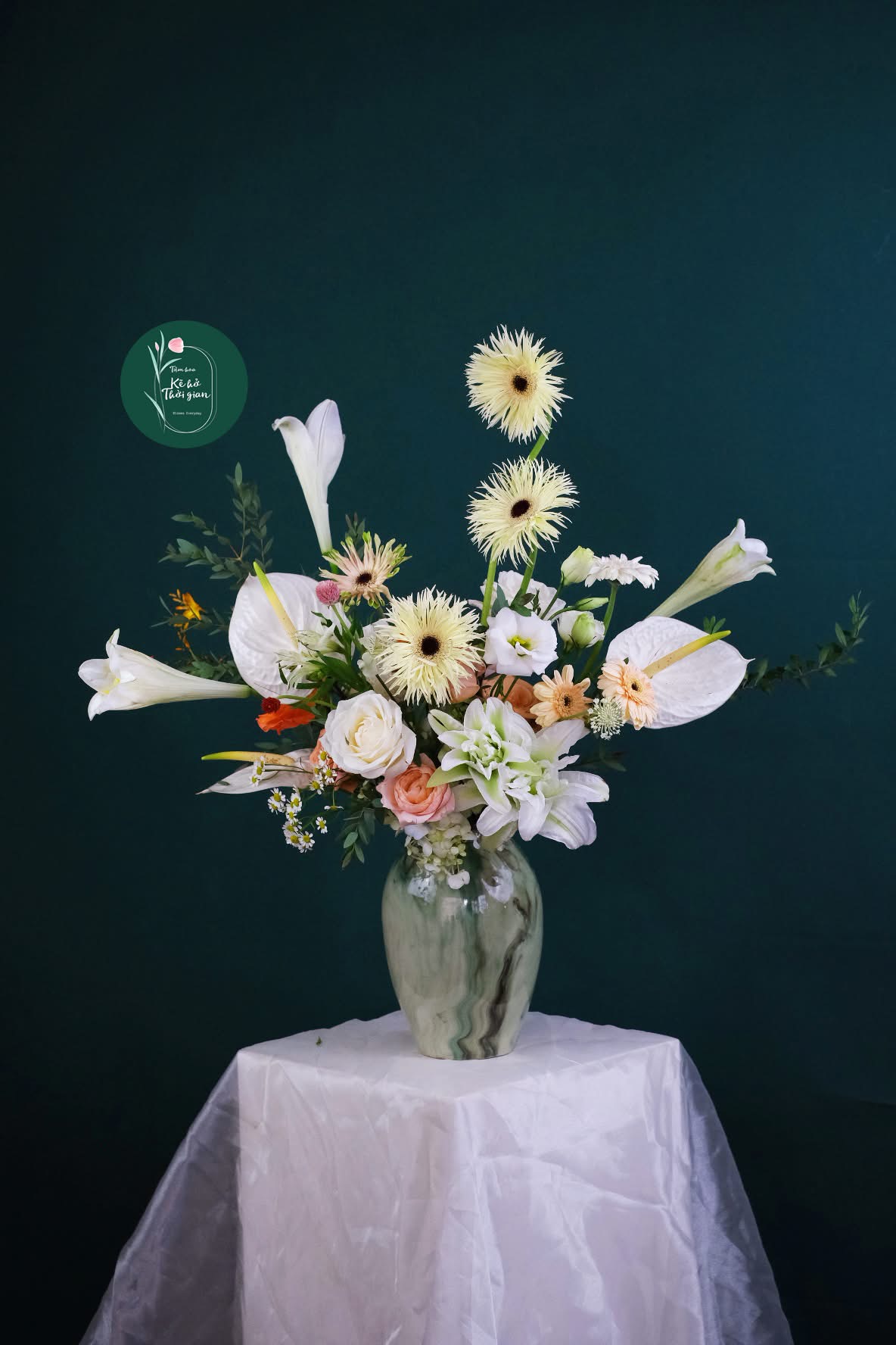 Bình hoa nghệ thuật mang phong cách thanh lịch, kết hợp tinh tế giữa ly trắng, hồng pastel, cúc mẫu đơn, hướng dương nhí và lan hồ điệp, tạo nên tổng thể hài hòa và sang trọng. Với tông màu trang nhã, bình hoa thích hợp trang trí phòng khách, bàn tiệc hoặc làm quà tặng đẳng cấp trong các dịp đặc biệt. Đặt ngay để mang vẻ đẹp tự nhiên và tinh tế vào không gian sống của bạn!
