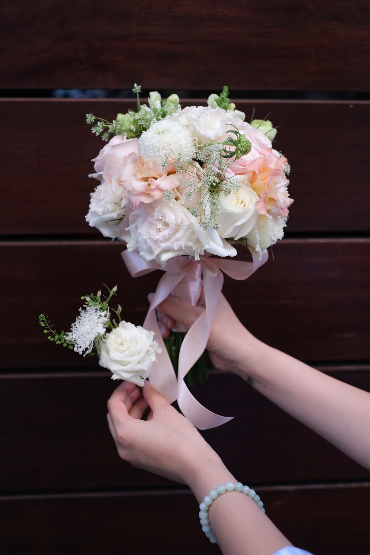 Tựa nụ cười e ấp của nàng dâu trong khoảnh khắc hạnh phúc nhất đời. - “Trong Trẻo Như Mơ”là bó hoa cưới được kết hợp từ hoa cát tường, hồng trắng và các hoa lá phụ cùng tông trắng, tạo nên vẻ đẹp nhẹ nhàng, tinh khôi và thuần khiết. Mỗi cánh hoa là lời thì thầm dịu dàng về một tình yêu trọn vẹn, về sự khởi đầu trong sáng và đầy hy vọng.