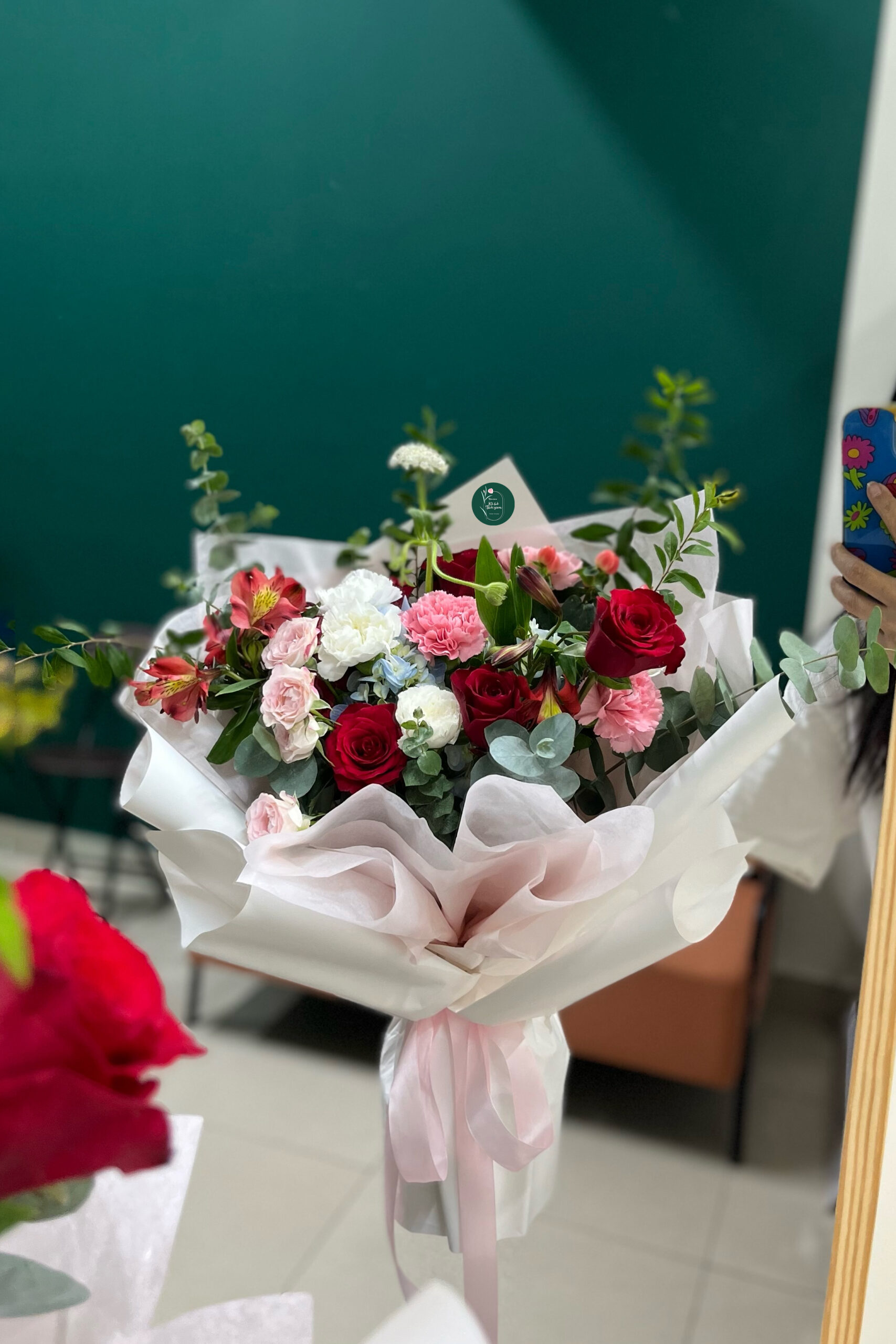 💗 Hồng – trắng của cẩm chướng và thúy châu – dịu dàng, tinh khôi, điểm xuyết thêm những nhánh lá xanh tươi mát.